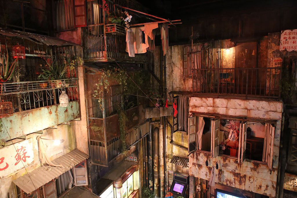 Next you found yourself in a long hallway that mimics walking down one of Kowloon’s narrow city streets. The attention to detail was astounding. You could hear muted street sounds all around you. As you walk past the doors/windows you overheard noises and voices behind the walls. It sounded like bits and pieces of conversations. Often you could look through the windows and see little scenes and apartments. It was all really well done with lots of great details. But the real treat awaited upstairs – which you reached via a cool elevator.