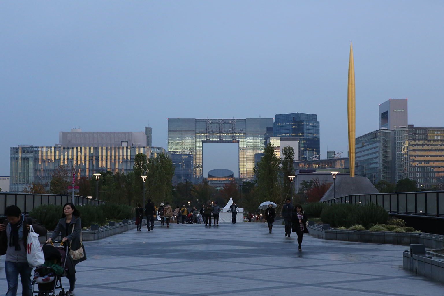 It has absolutely enormous buildings in a large-scale city-planning style. Capturing the scale of this complex is very difficult due to the huge buildings and the gigantic open spaces between them. The whole place feels like a bit like those images of Chinese ghost cities but with odd futuristic buildings that look nearly empty and few people walking around. It was actually kinda creepy.